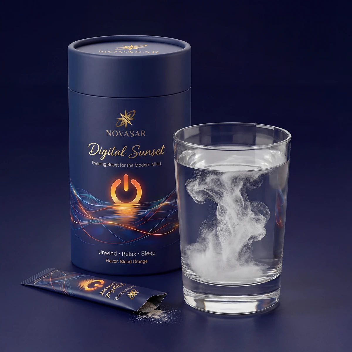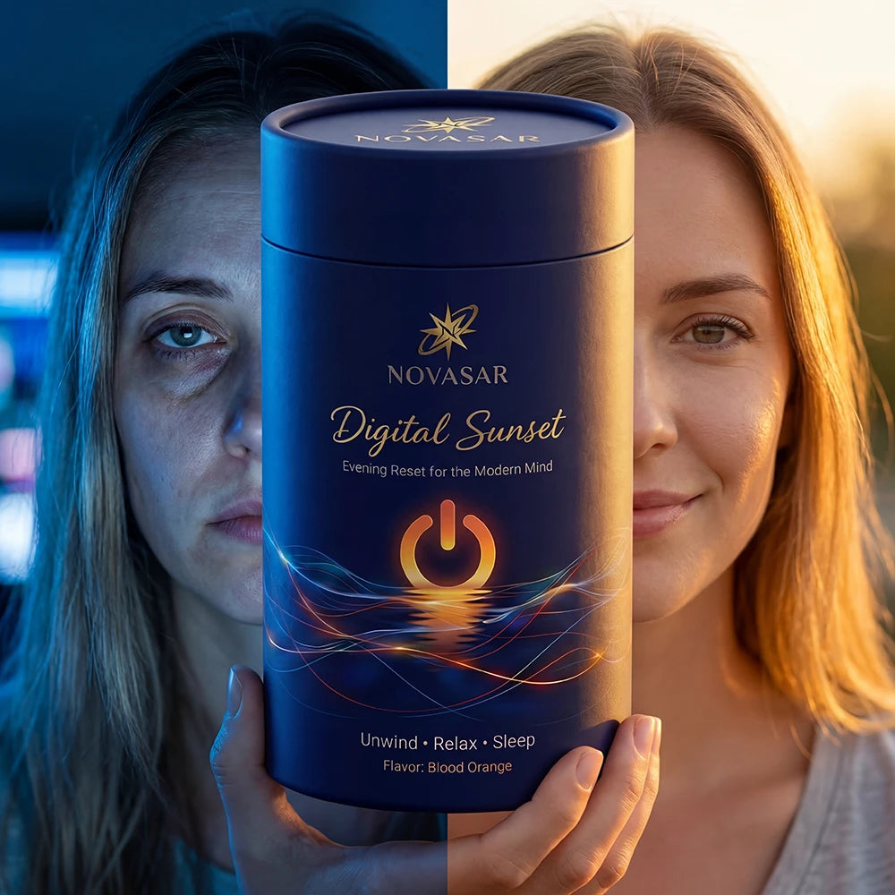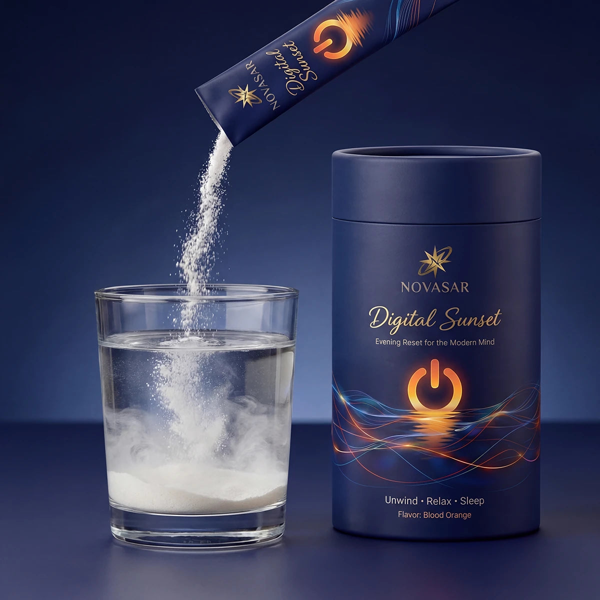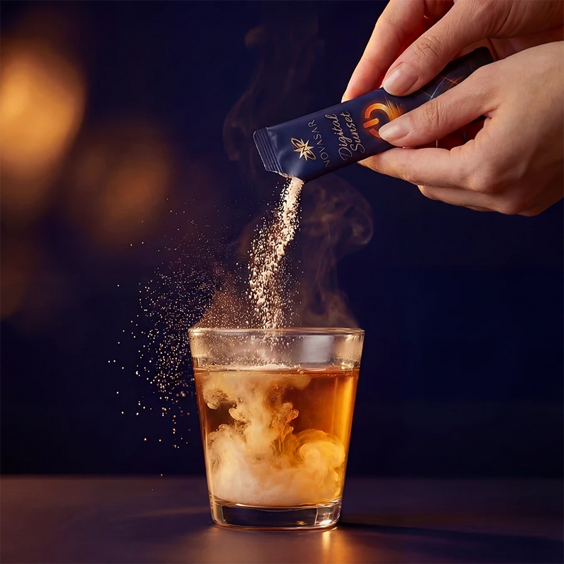 Pour Digital Sunset into 300ml of cold or warm water. The blood orange flavor signals to your brain: the day is done. This is your transition moment.