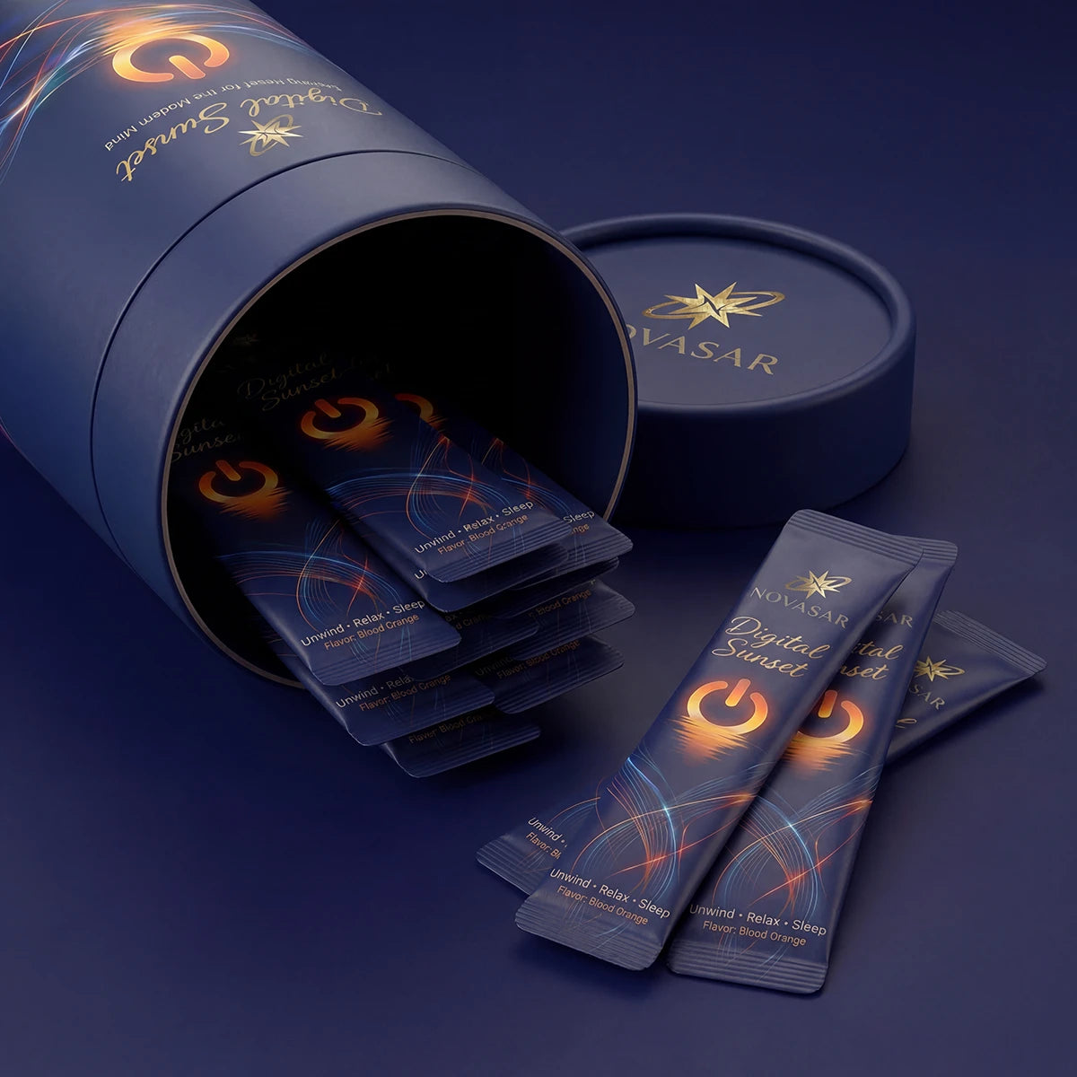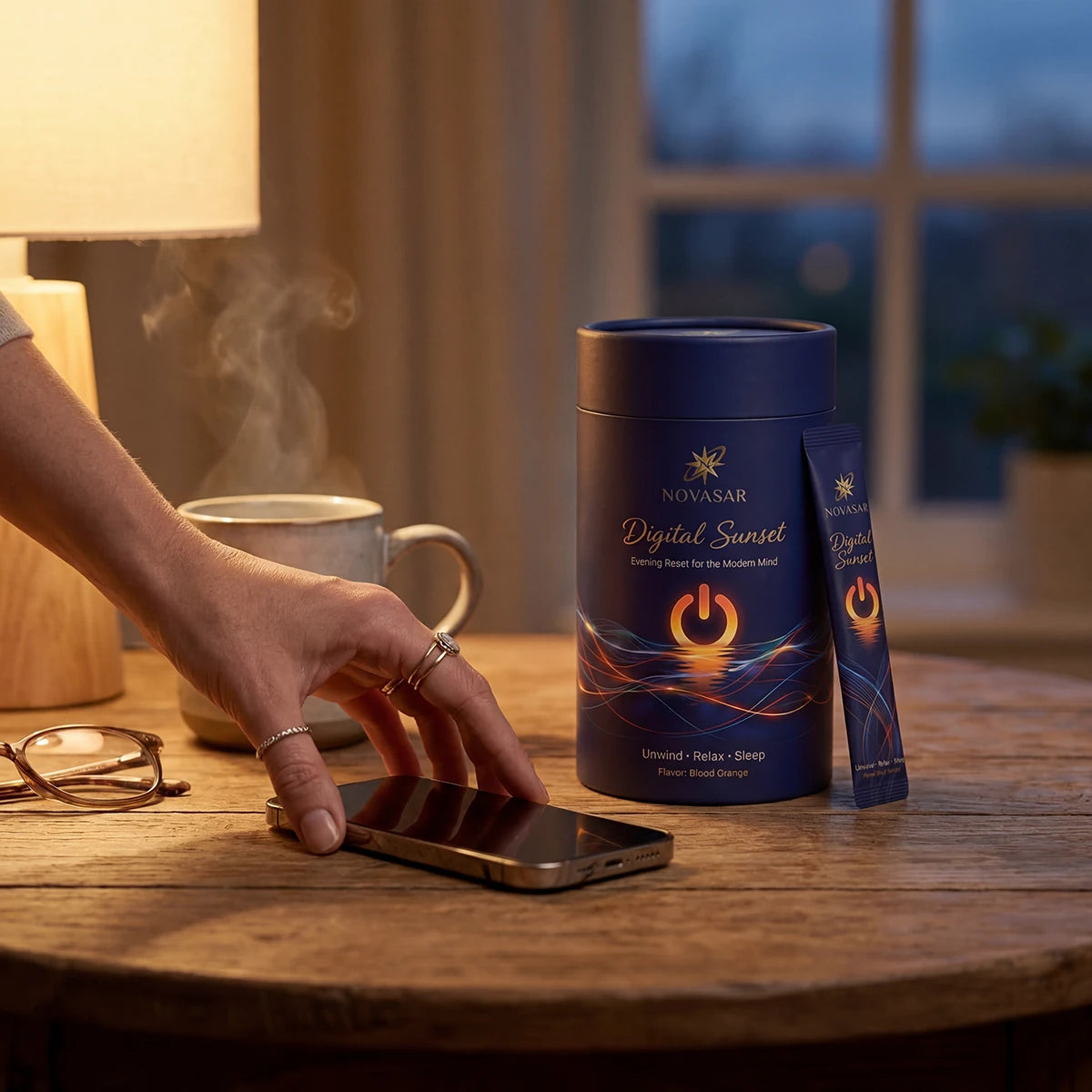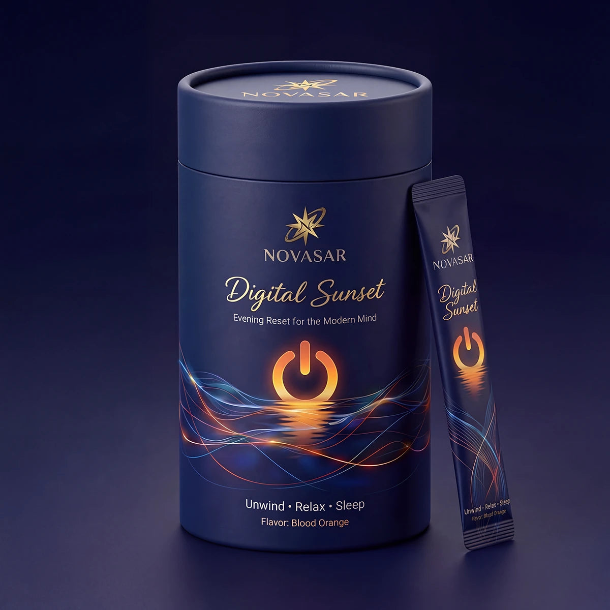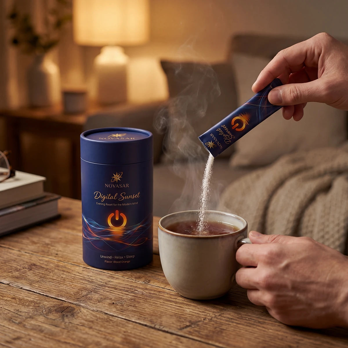 Pour Digital Sunset into 300ml of cold or warm water. The blood orange flavor signals to your brain: the day is done. This is your transition moment.